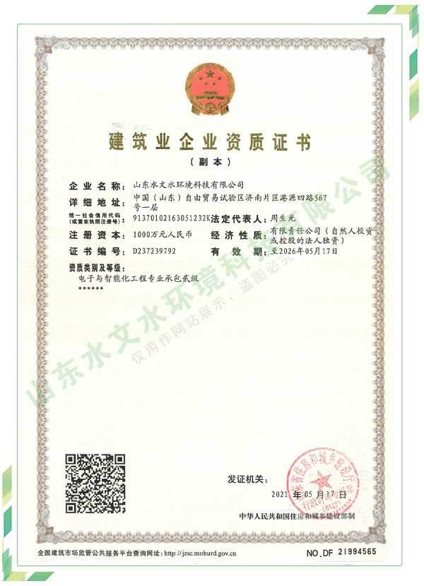 公司自1992年成立至今 ,經過全體員工努力和探索,不斷壯大。現具有水文、水資源調查評價資質證書(甲級).建設項目水資源論證單位水平評價證書(省屬、壹級)、建設項目環境影響評價資質證書(乙級、農林水利)、生產建設項目水土保持方案編制單位水平評價證書(三星)、生產建設項目水土保持監測單位水平評價證書(一星).工程設計行業資質證書(乙級、水利行業–水文設施)等專業資質。
